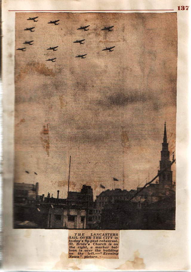 The Lancasters sail over the city in today’s fly past rehearsal. St Bride’s Church is on the right, a marker balloon is over the building on the left – “Evening News” picture.