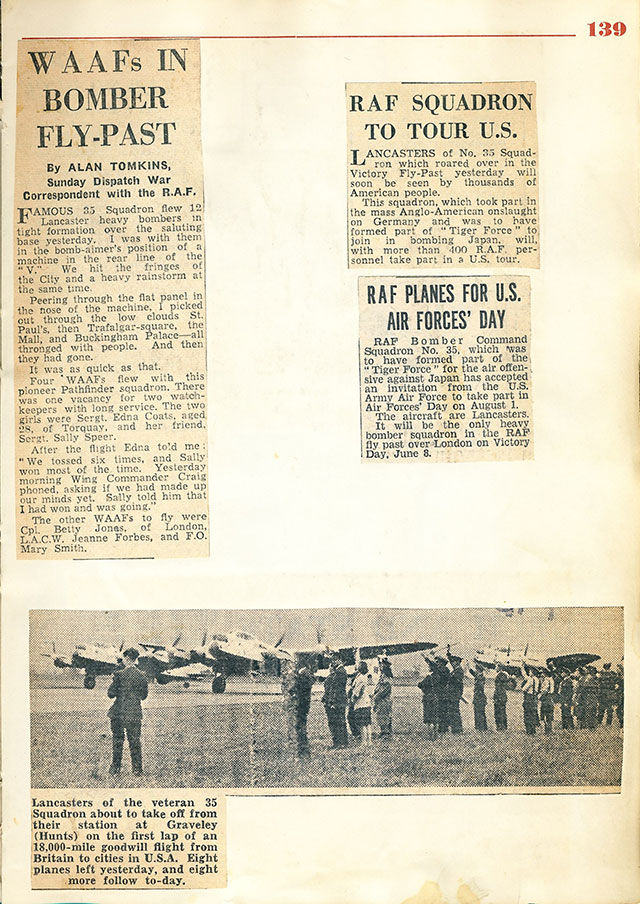 RAF Bomber Command Squadron no. 35, which was to have formed part of the Tiger Force for the air offensive against Japan has accepted an invitation from the US Army Air Force to take part in Air Forces’ Day on August 1. The aircraft are Lancasters. It will be the only heavy bomber squadron in the RAF fly past over London on Victory Day, June 8.
