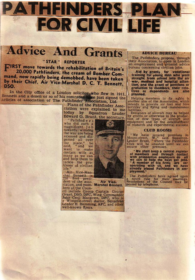 In the City office of a London solicitor who flew in 1911, Bennett and a dozen or so of his comrades have just signed the articles of association of the Pathfinder Association Ltd. Plans of the Pathfinder Association were explained to me today by Squadron Leader Edward G Brant, the secretary. “Pathfinders who did such a magnificent job towards winning the war are being released and dispersed all over the place,” he said, “and we want to make contact with as many as we can and help them to tackle the problems of civilian life.”